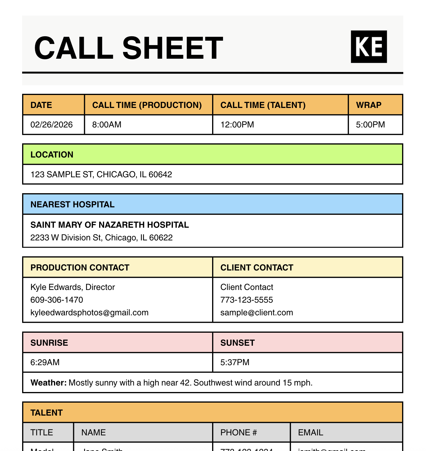 Organization is the glue that holds a successful shoot together. Once we’ve ironed out all of the creative and technical details, I’ll generate several easy-to-read documents that contain all necessary information.